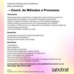 Inscrever-seGarantir a eficiência, padronização e melhoria contínua dos processos produtivos e operacionais da empresa, por meio da análise crítica dos fluxos, desenvolvimento de métodos, definição de tempos e implantação de soluções que otimizem recursos, aumentem a produtividade e assegurem a qualidade.
