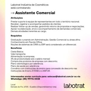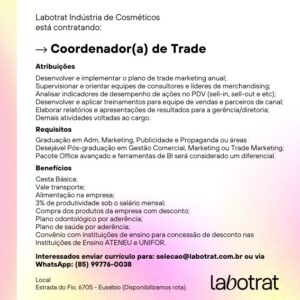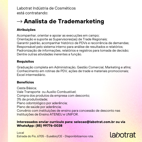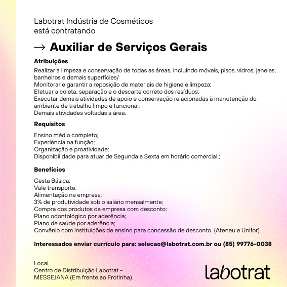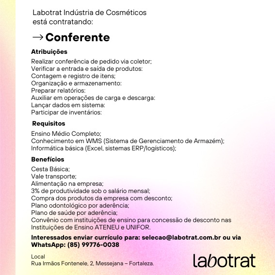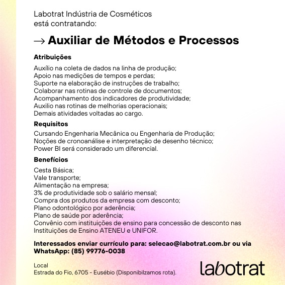 Ao fazer parte da Labotrat, você se junta a uma empresa que acredita no potencial de todos e que tem como missão transformar sua beleza para que você possa transformar o mundo.