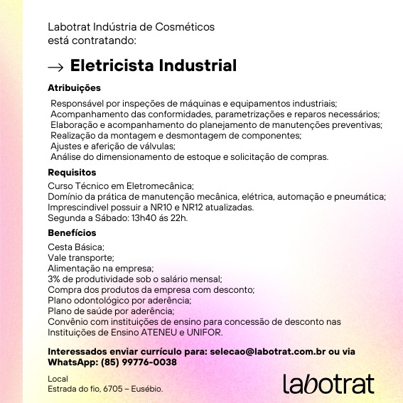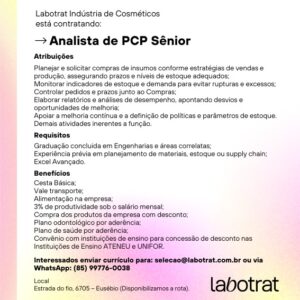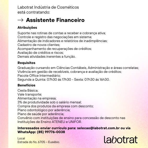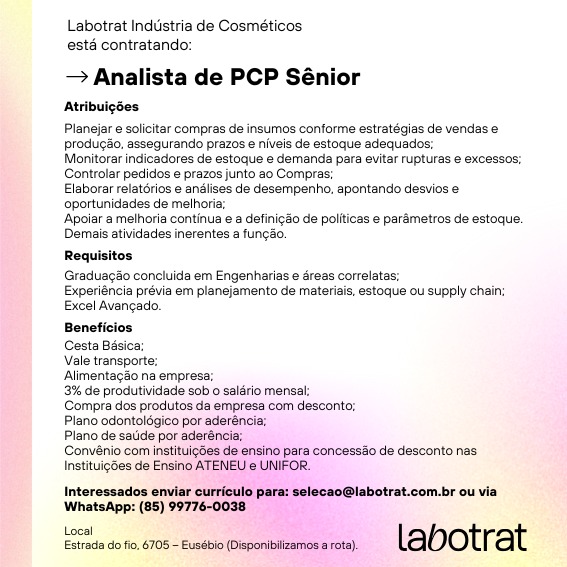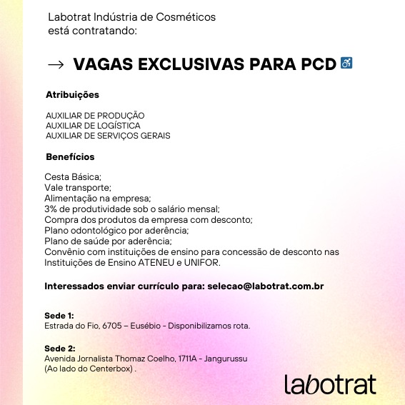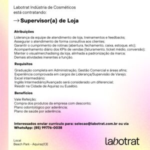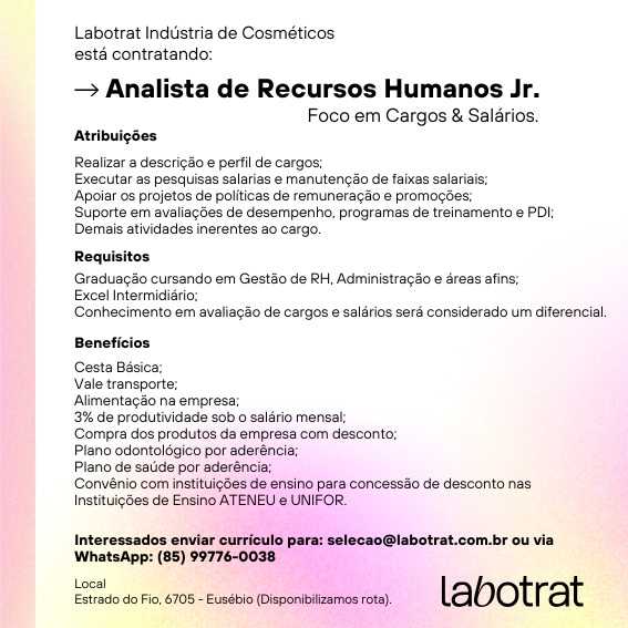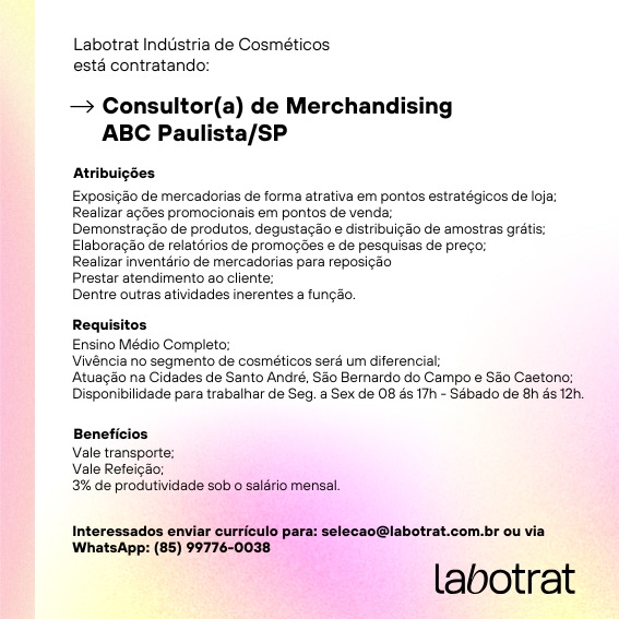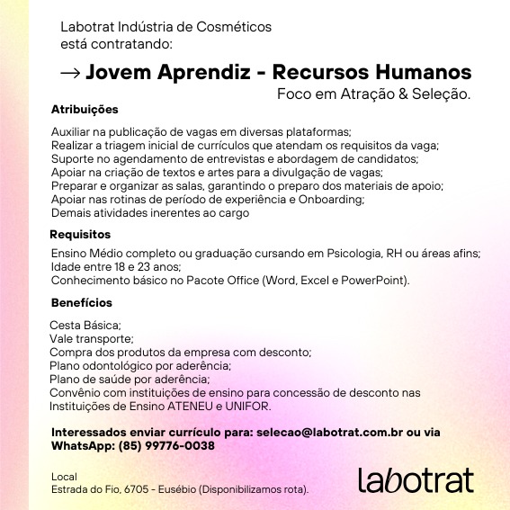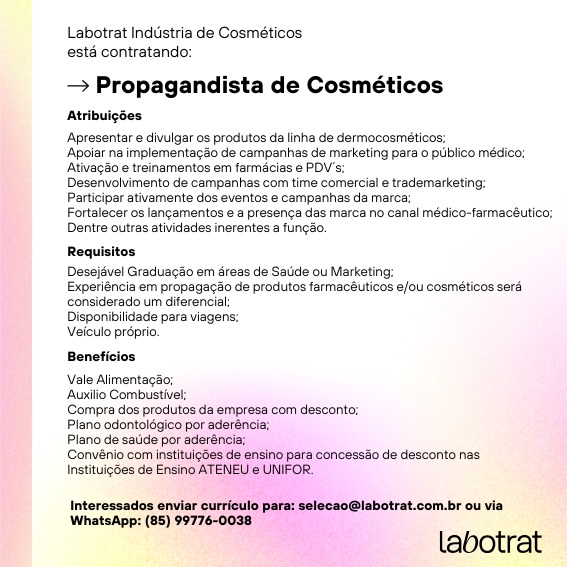 Na Labotrat, acreditamos que a beleza vai além da estética: ela é um reflexo de bem-estar, confiança e cuidado. Se você busca fazer parte de uma equipe de alta performance que inspira e vem remodelando o mercado da beleza no Brasil, venha crescer com a gente! Juntos, vamos desenvolver produtos inovadores e construir um futuro mais inclusivo onde cada vez mais as pessoas possam cultivar sua melhor beleza.