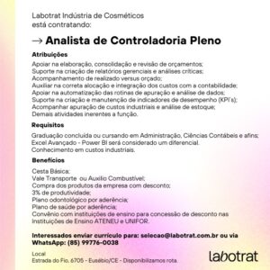 Apoiar na elaboração, consolidação e revisão de orçamentos. Suporte na criação de relatórios gerenciais e análises criticas, dentre outras funções inerentes ao cargo.