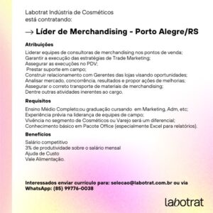 Liderar equipe de consultoras de merchandising nos pontos de venda; Garantir a execução das estratégias de Trade Marketing; Assegurar as execuções no PDV; Demais atividades voltadas a área.